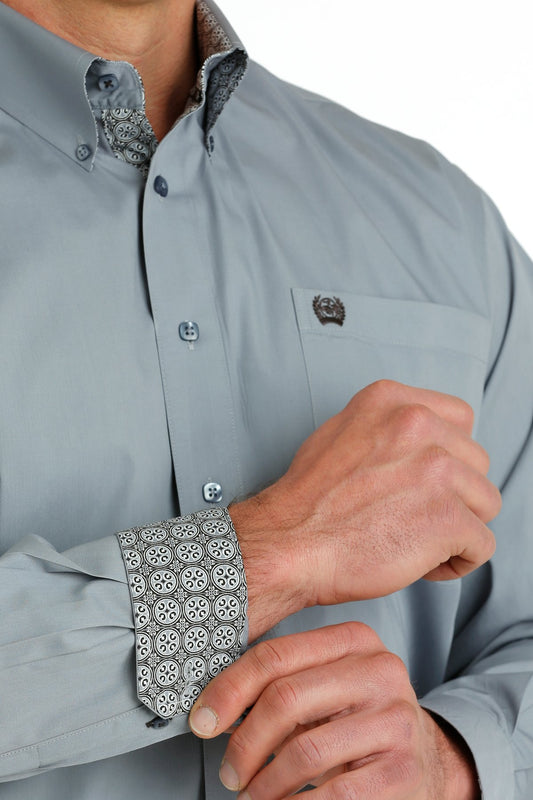 Men's Solid Grey Button Down Western Shirt with Printed Cuffs