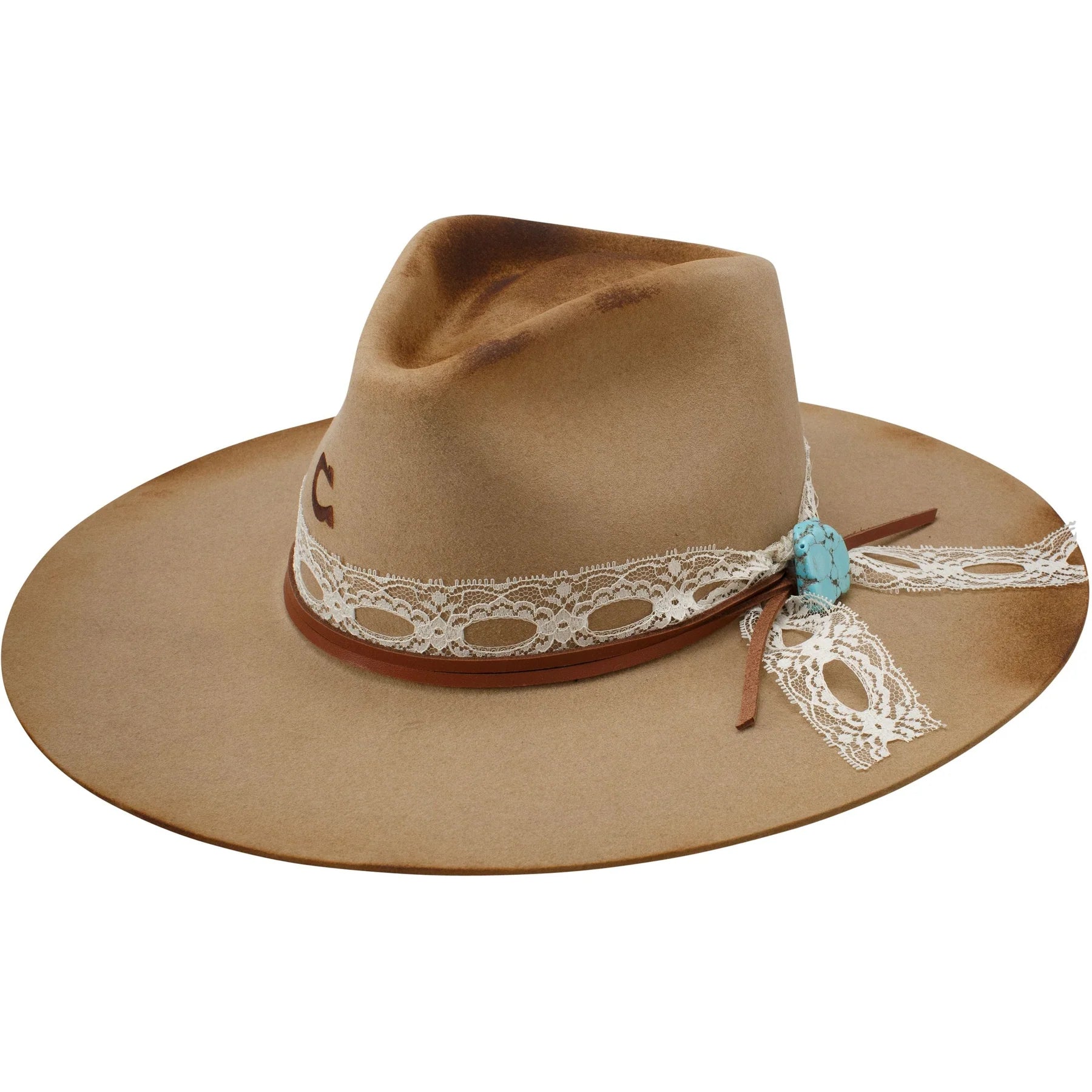 Authentic and ranch ready, the Smoke Show has distressed details on a rich buck wool felt for that perfect already worn look.  But the ladylike details like lace ribbon band, turquoise color stone concho and leather strips make this hat fit for the coolest cowgirl.