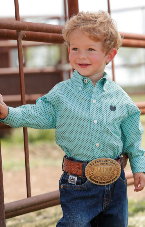 Every stylish young man needs a handsome shirt like this classic light blue woven geometric printed cotton plain weave. An ideal match for blue jeans or khaki pants, this shirt features white buttons, an open left front pocket and CINCH logo embroidery.
