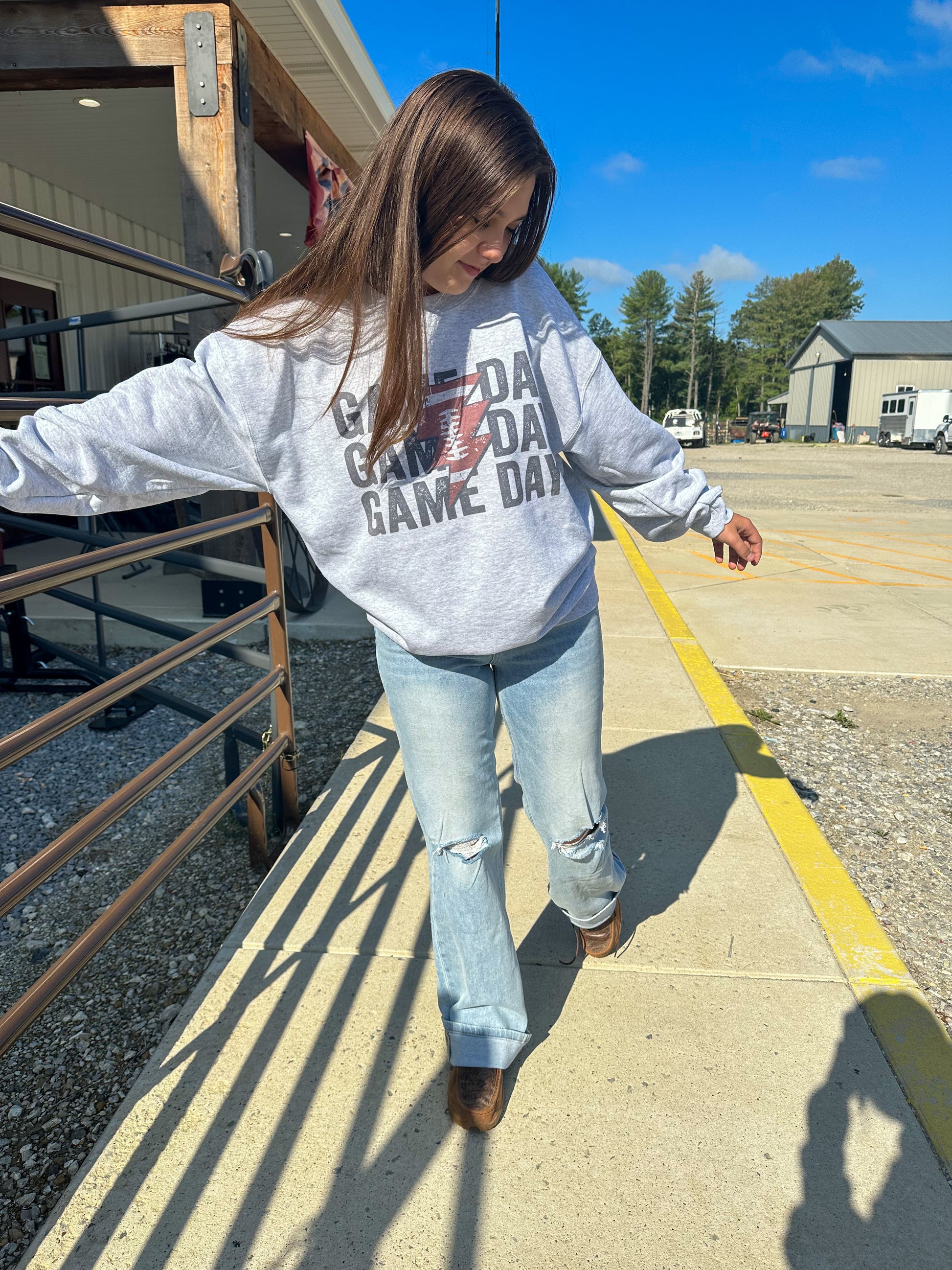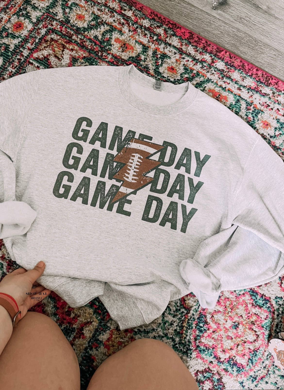 Score a touchdown with this "Game Day" Football Stacked Graphic Sweatshirt! Its unique green font boldly stands out, perfect for making a statement on game day. Enjoy supreme comfort-level in this ultra-soft and cozy sweatshirt - you'll be cheering all season long!