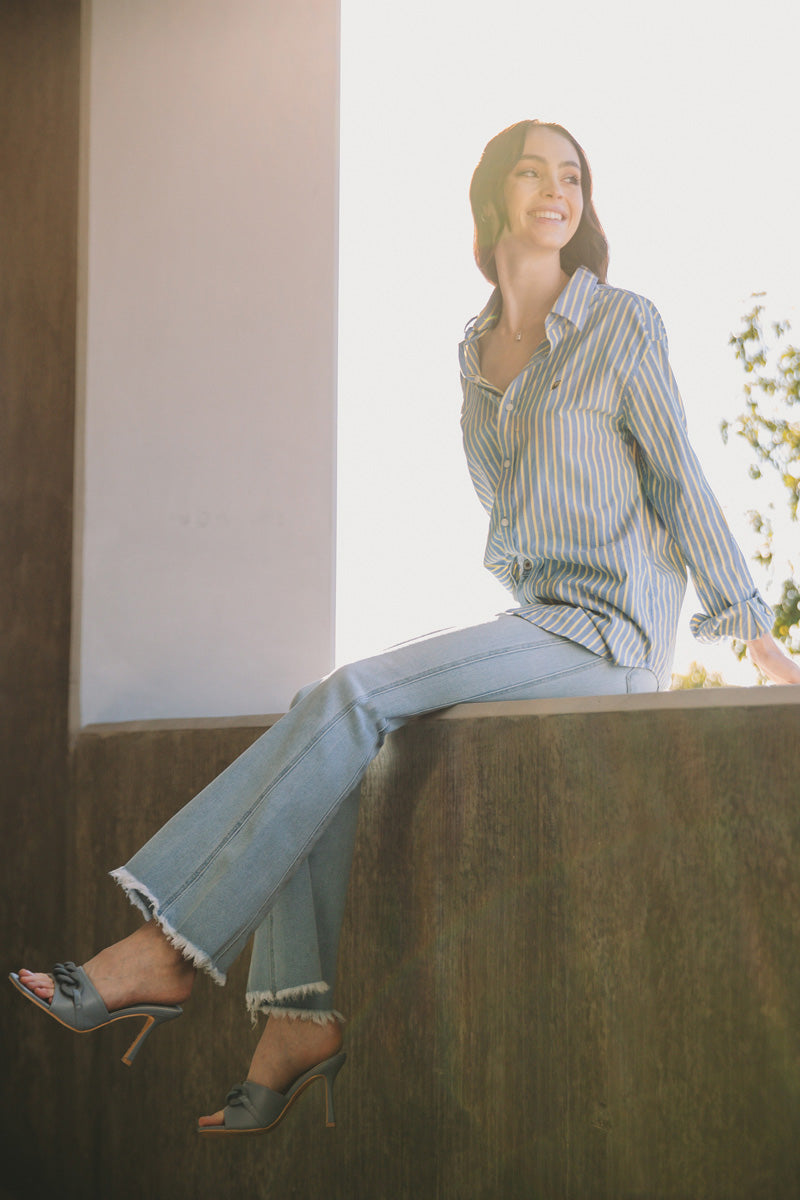 Our Annika High Rise Jeans feature a flared cut with a raw hem that gives this style a rustic look that's stylish and chic. Sits right above the natural waistline as it tapers down the thigh and begins to flare out at the calf. Made with buttery-soft, super-stretch denim, that's durable and flexible. Features a classic five-pocket design, single-button front, and zip-fly closure.