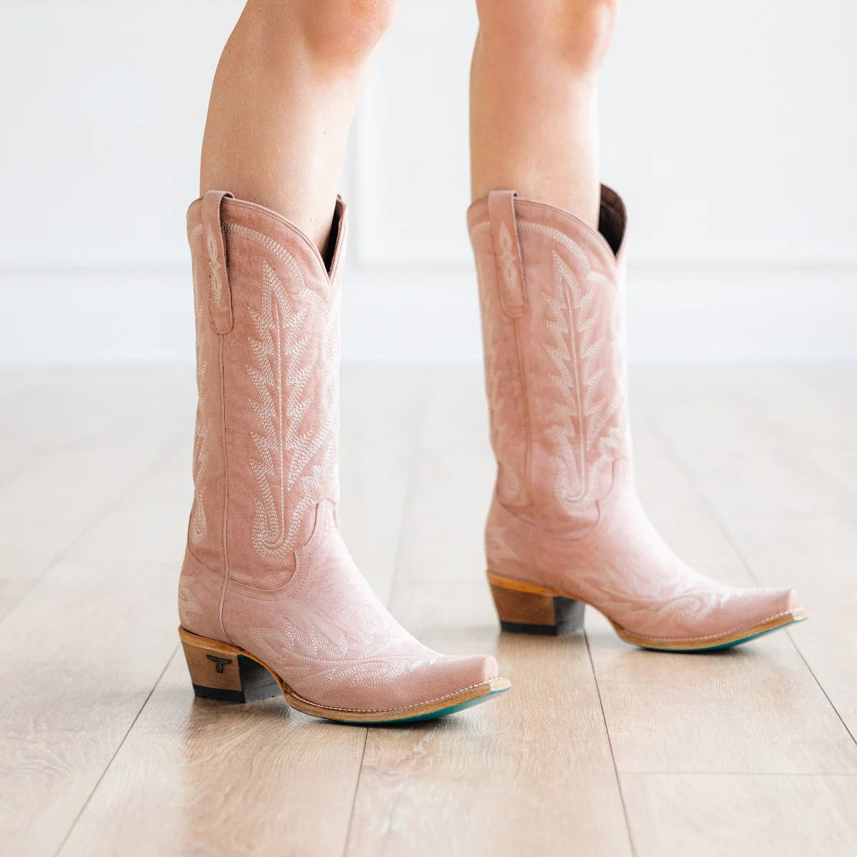 She's the perfect blush cowgirl boot. Heirloom quality with a western vibe. The classic snip toe profile is embroidered to perfection with a twist on traditional flame stitch. Her Blush finish makes it a perfect fit for everyday to girl's night out.