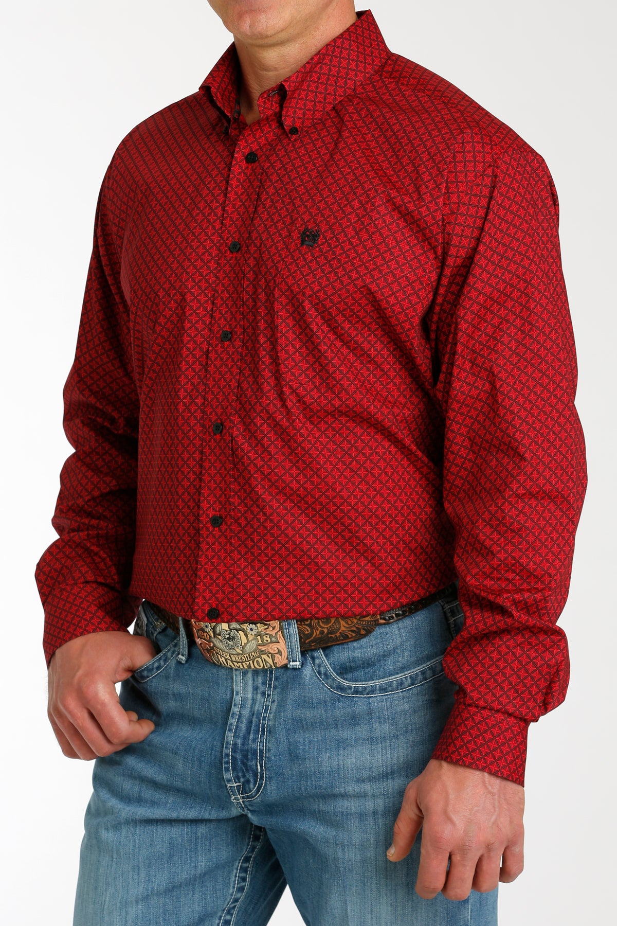 Men’s Long Sleeve Black and Red Geometric Print Stretch Fit Button Up