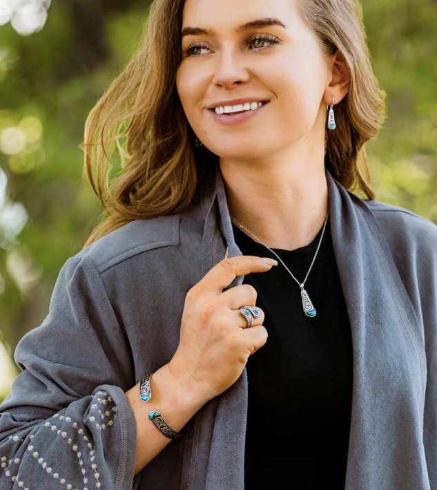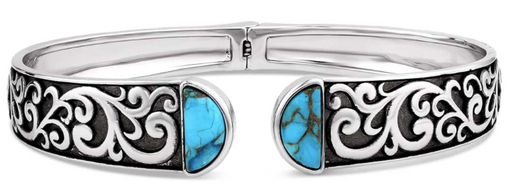 Stand out from the rest with the Heavenly Waters Bracelet. This Bracelet features stunning antiqued silver tone filigree designs throughout. A turquoise stone fills the ends of the bracelet, adding striking contrast to the piece. This bracelet is hinged for easy wear. Stone color may vary.
